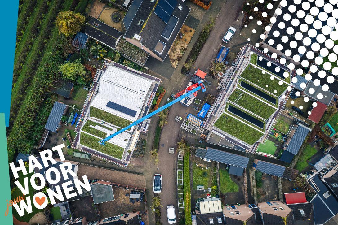 In Den Dungen zijn zes verduurzaamde woningen opgeleverd. Dit zijn de eerste woningen waar we innovatieve groene daken hebben toegepast. De bestaande dakconstructies zijn vervangen door goed geïsoleerde prefab dakelementen gevuld met inblaasstro – samen meer dan 13.500 kilo natuurlijk isolatiemateriaal. Daarbovenop liggen biobased ROEF-trays met een mengsel van inheemse kruiden.